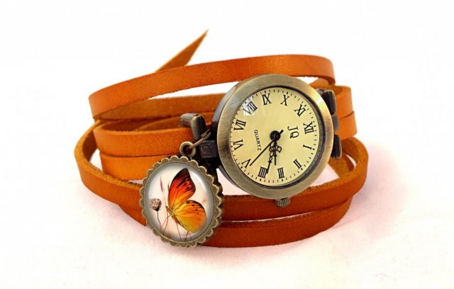 Zegarek ze skórzanym paskiem kilkakrotnie zakręcanym na ręku z ręcznie robioną zawieszką (kaboszonem).