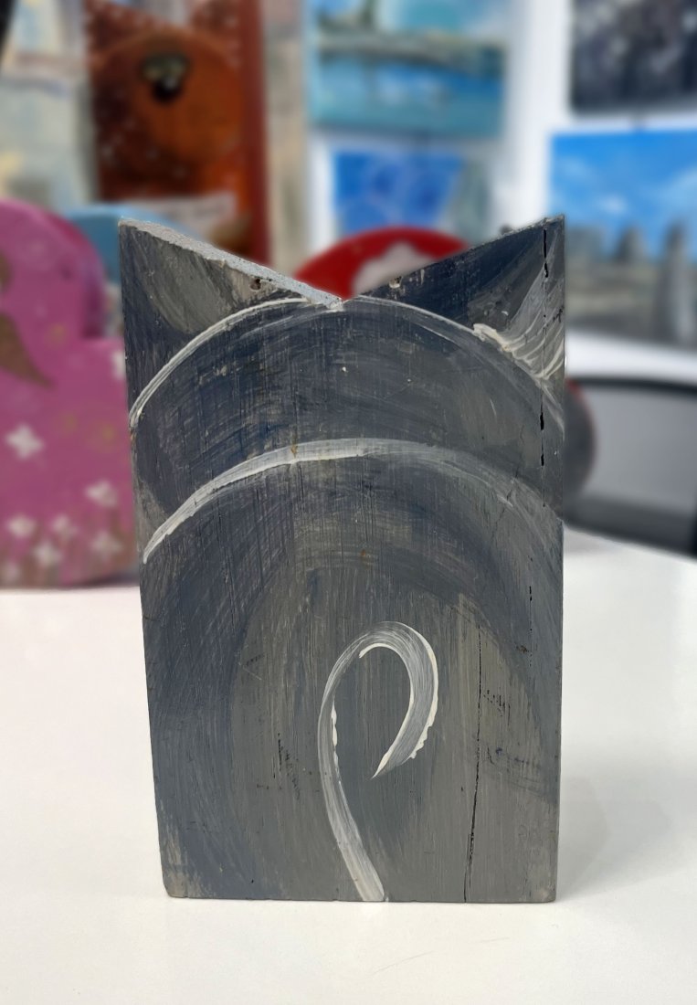Kotek został wykonany z naturalnej, dębowej deseczki o wymiarach 6,5 × 13 × 2,5 cm.