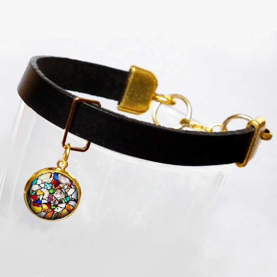 Bransoletka z unikatową grafiką artystyczną umieszczoną pod wypukłym szkłem tzw. kaboszonem dającym efekt trójwymiarowości i oprawioną w hipoalergiczną bazę w kolorze złotym. Oczko z grafiką przymocowane do skórzanego ciemnobrązowego rzemienia o szerokości 1 cm. Zapięcie hipoalergiczne w kolorze złota. Prostokątna przekładka- pokryte 16 karatowym złotem.