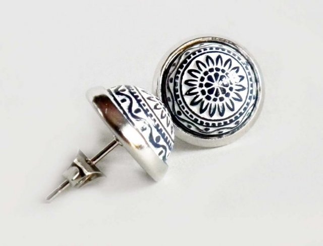 Małe kolczyki wkrętki, z piękną żywicą akrylową w mozaikowy, delikatny wzorek w kolorze bieli i granatu, w oprawie w kolorze srebra.