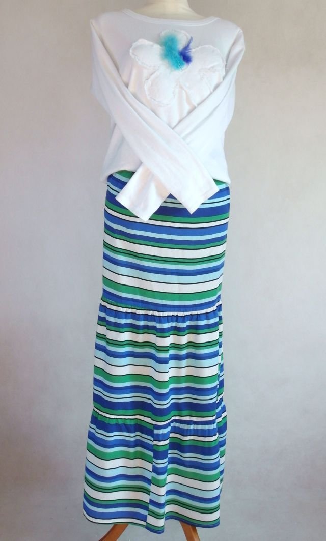 w pasie na gumce. składa się z trzech pasów - pierwszy raczej wąski, drugi i trzeci są w rodzaju szerokiej falbany.Kolory wyraziste, zieleń, biały, miętowy, niebieski. super do trampek.