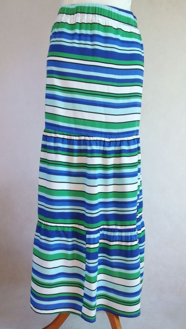 w pasie na gumce. składa się z trzech pasów - pierwszy raczej wąski, drugi i trzeci są w rodzaju szerokiej falbany.Kolory wyraziste, zieleń, biały, miętowy, niebieski. super do trampek.