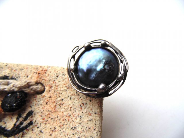 Lekki pierścionek, wykonany techniką witrażową z miedzi, cyny i słodkowodnej perły. Obrączka posrebrzana, regulowana. Średnica ok. 2,8 cm.