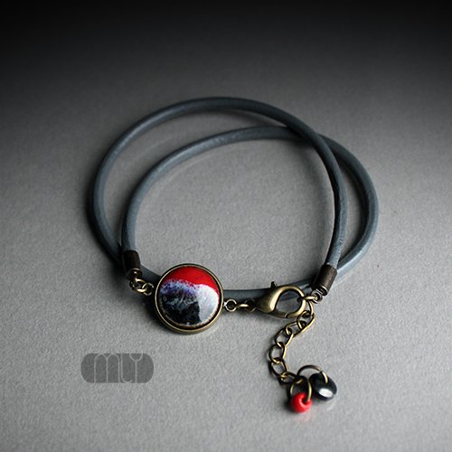 Efektowna bransoletka wykonana z rzemienia jubilerskiego, elementów w kolorze starego złota i ręcznie wykonanej ceramicznej zawieszki, szkliwionej mieszanką czerwonych i szarych szkliw z efektem plamek o subtelnym połysku, Obwód regulowany. Polecam