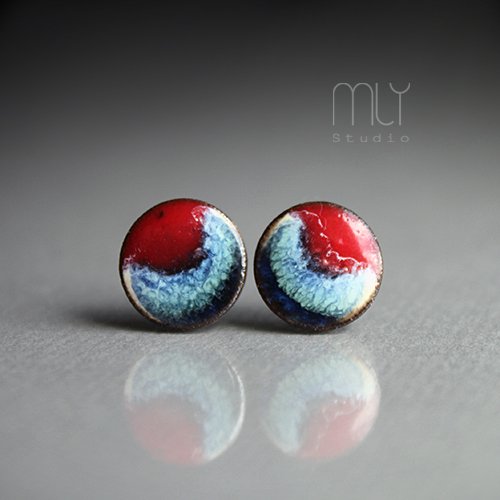 Ceramiczne, lekko nieregularne kolczyki w formie sztyftów, ręcznie wykonane z pięknej delikatnej gliny kamionkowej, jednostronnie szkliwione efektownym kremowobłekitnym i czerwonym błyszczącym szkliwem z efektem plamek, na antyalergicznych sztyftach w kolorze srebrnym.Średnica ok. 11mm. Polecam