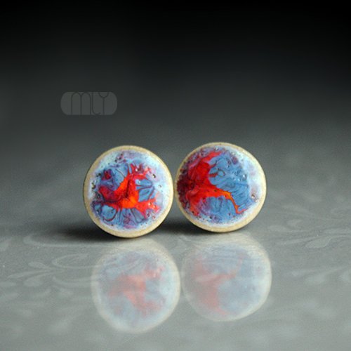 Ceramiczne, lekko nieregularne kolczyki w formie sztyftów, ręcznie wykonane z pięknej delikatnej gliny kamionkowej, jednostronnie szkliwione efektownym kremowobłekitnym i czerwonym błyszczącym szkliwem z efektem plamek, na antyalergicznych sztyftach w kolorze srebrnym.Średnica ok. 11mm. Polecam