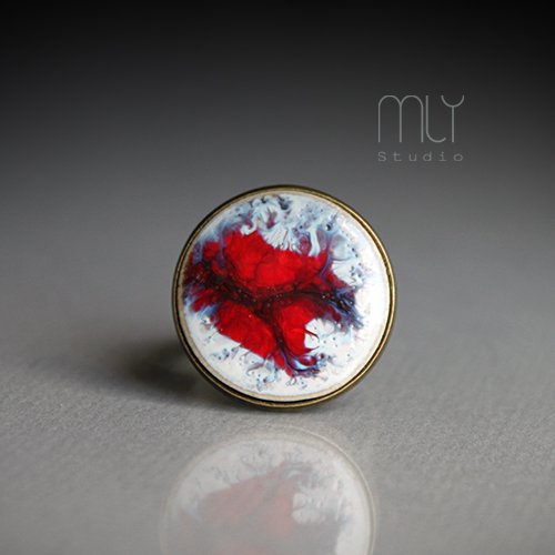 Efektowny pierścień z ceramicznym oczkiem, ręcznie wykonanym z gliny kamionkowej, poszkliwionym mieszanką czerwono kremowych szkliw z efektem plamek.Obrączka regulowana w kolorze starego złota średnica oczka ok 20mm. Polecam. Termin realizacji zamówienia to 1-2 dni.. Termin realizacji zamówienia to 1-2 dni.