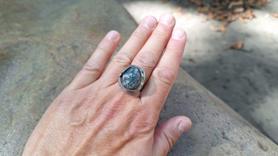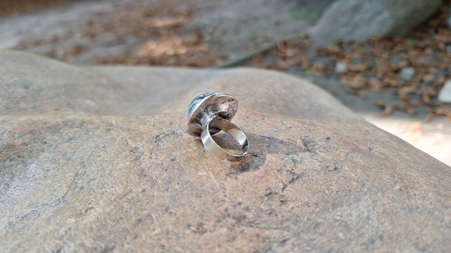 Pierścionek wykonany z miedzi, cyny i agatu mszystego. Wymiary ok. 2 na 1.7 cm. Regulowany. Nie jest ciężki.