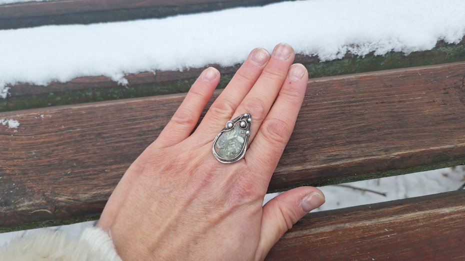 Pierścionek wykonany z miedzi, cyny i agatu mszystego. Wymiary ok. 3 na 1.5 cm. Regulowany. Nie jest ciężki.