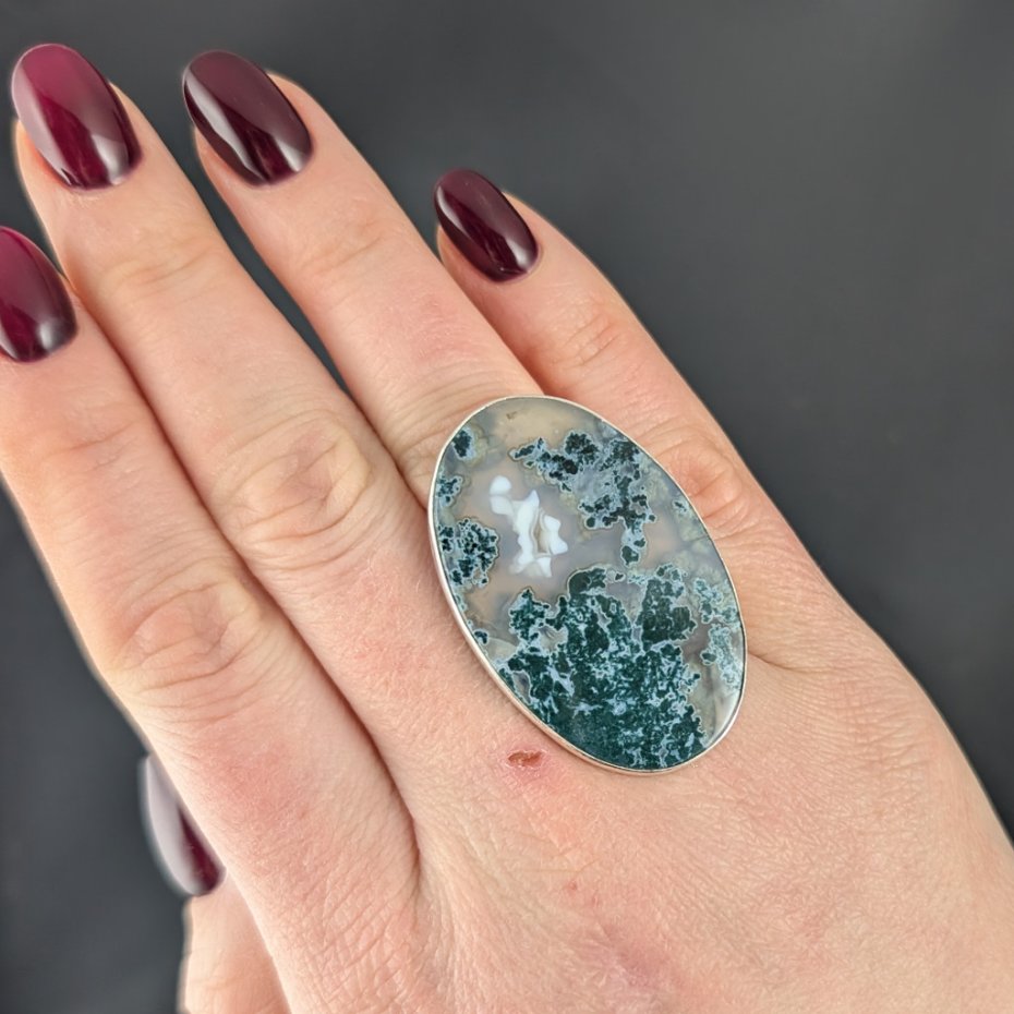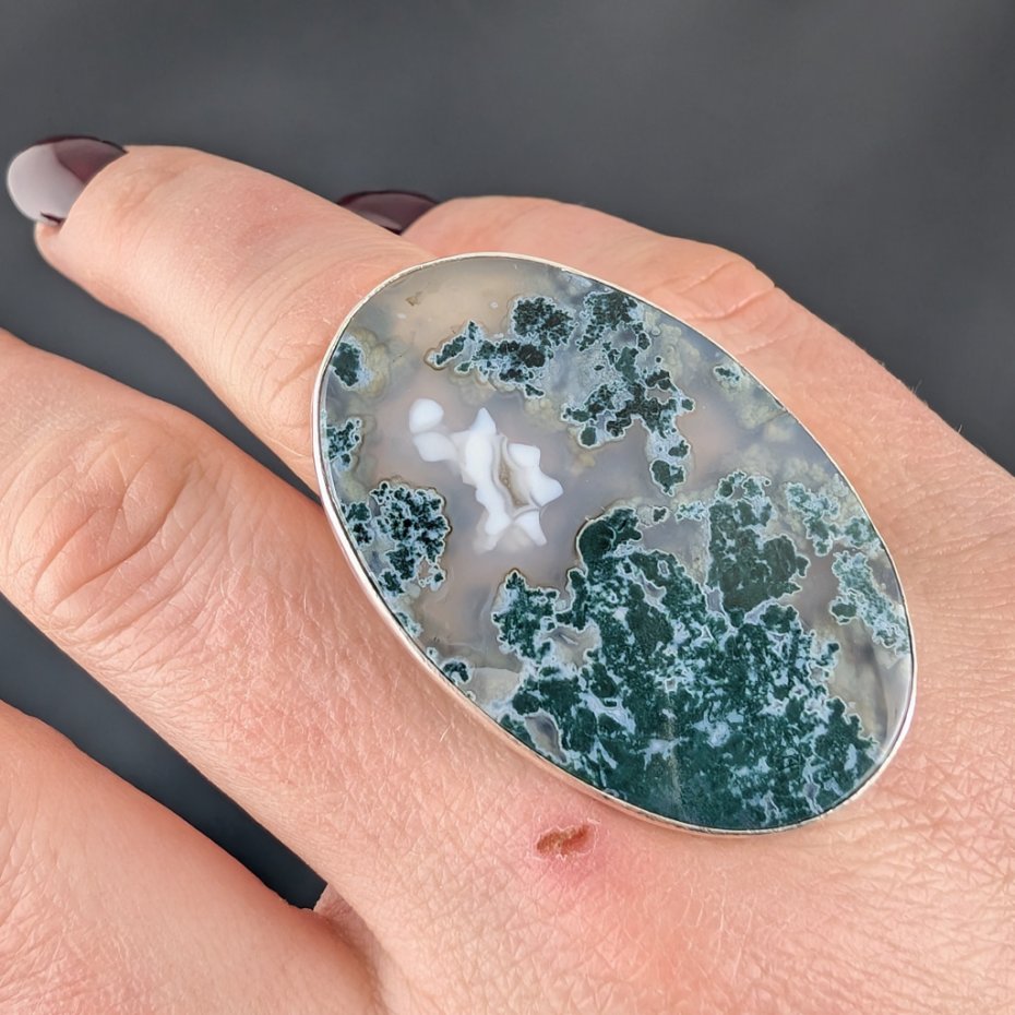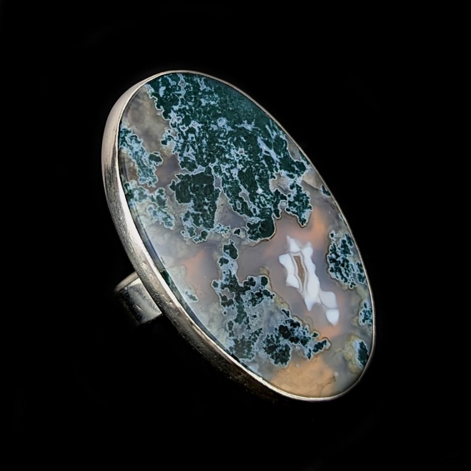 Pierścień z pięknym agatem mszystym. Kamień oprawiony w srebro pr. 925. Rozmiar pierścionka 14, mogę powiekszyć na max 18. Wymiary oprawy 42 x 27 mm,, waga 15,8 g, obrączka szer. 5 mm. Pierścień będzie zapakowany w ozdobne pudełeczko.