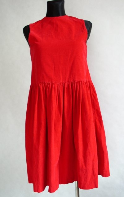 Sukieneczka bez rękawów dla dziewczynki.Brak metek.Odcięta na biodrach.Dół marszczony.Zapinana z tyłu na guziki.Góra na podszewce bawełnianej,białej w czerwone groszki.Materiał wierzchni,drobny sztruks.Stan bardzo dobry.Długość 95 cm.pod pachami 80 cm.pas 78 cm.Manekin był za duży i zdjęcie z tyłu bez zapinania guzików.Piękny krwisty kolor.
