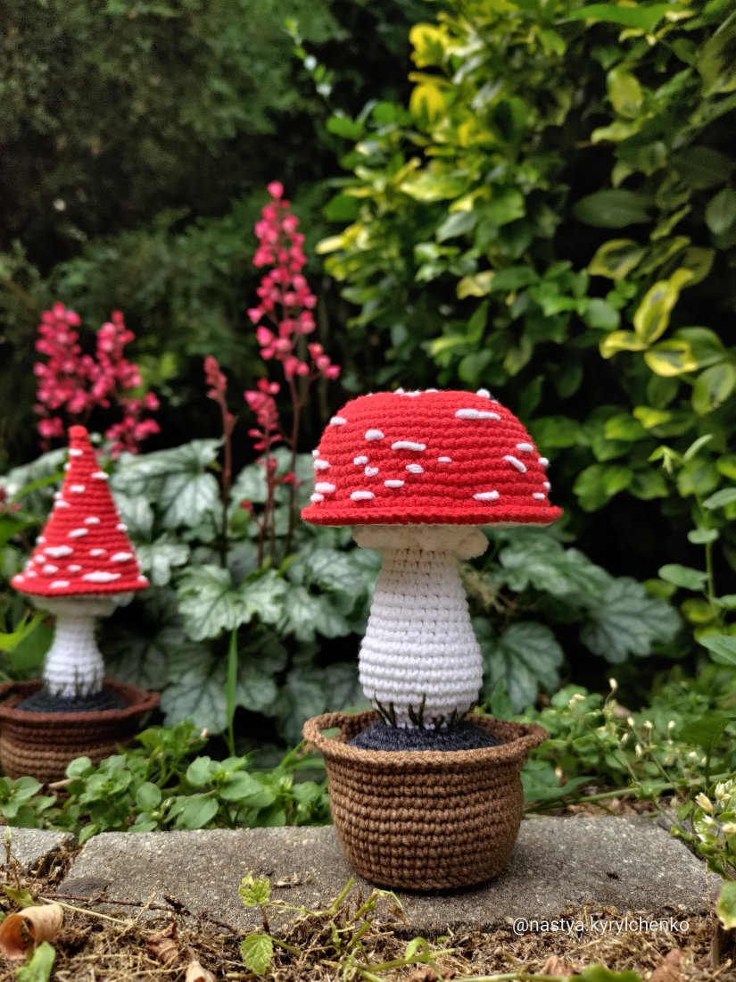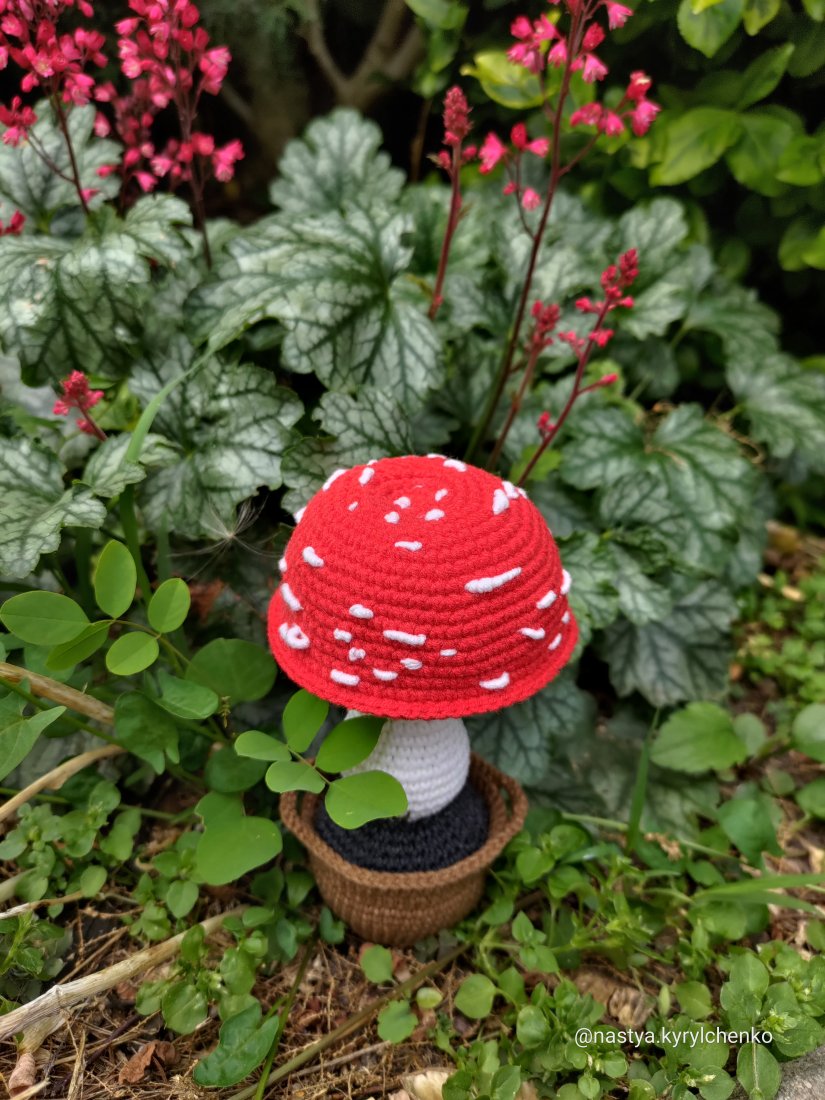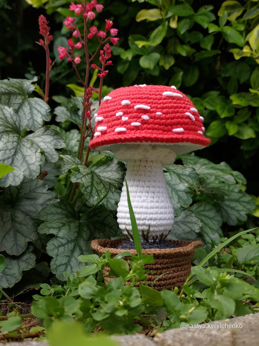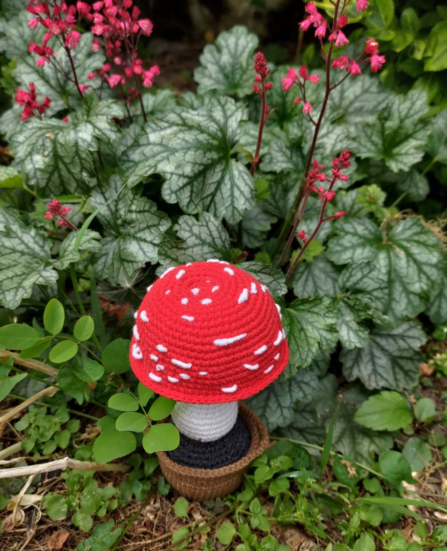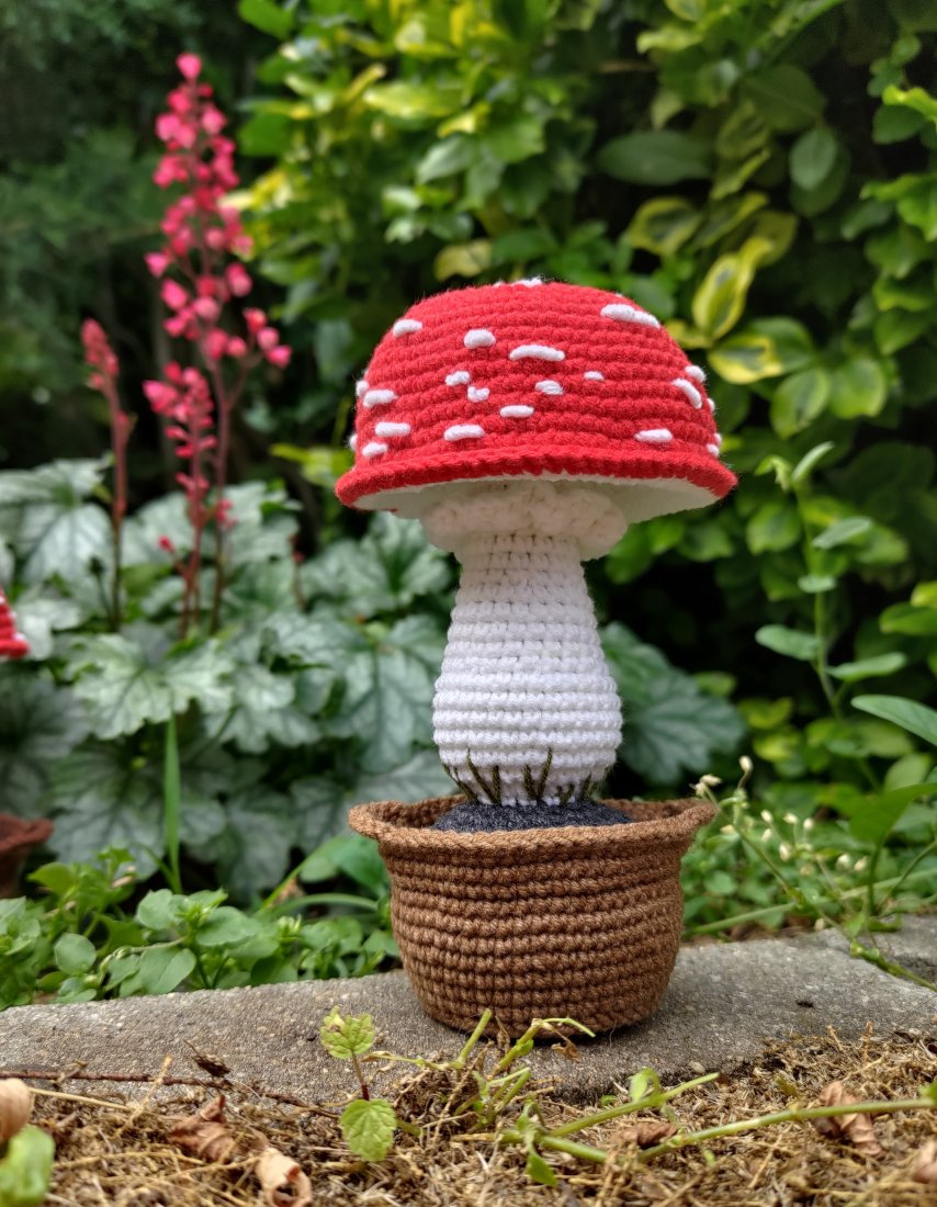 • Szydełkowany grzyb jest "zasadzony" w brązowej doniczce.