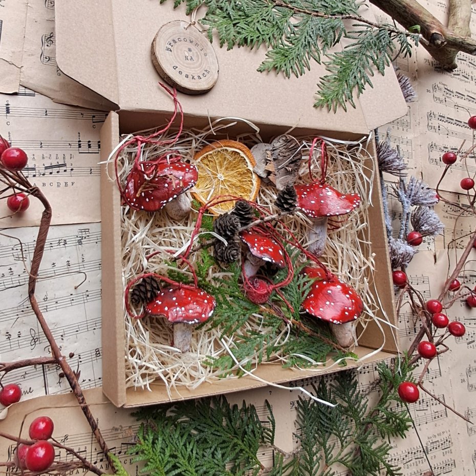 W tej ofercie przedstawiam grzybki wykonane z gliny samoutwardzalnej, pomalowane gotowe do powieszenia na choince ,girlandzie ,gałazkach... zapakowane w pudełko z drewnianym siankiem, całość widoczna na zdjęciach nie ma możliwości zmian.
