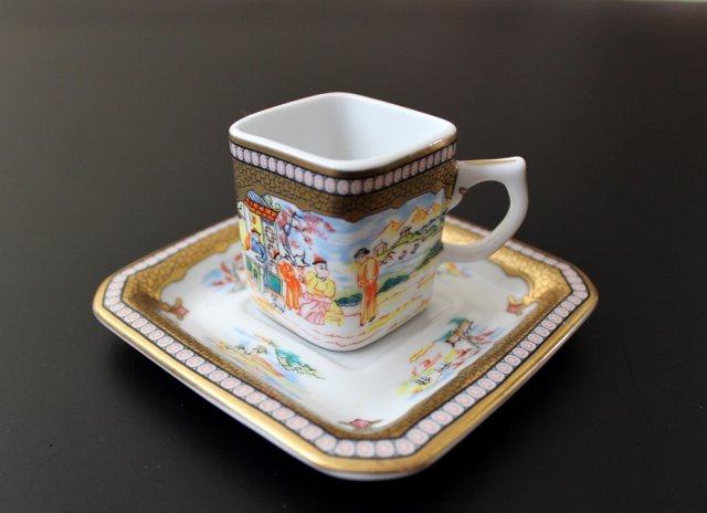 Śliczna porcelanowa filiżanka ze spodkiem.