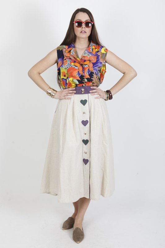 Piękna folkowa spódnica uszyta z lnu i bawełny, z wysokim stanem, kieszeniami i ozdobnymi guzikami imitującymi drewno. Zapinana z tyłu na zamek i guzik. Uszyta z dbałością o najdrobniejsze szczegóły. Spódnica jest w kolorze kremowym z lamówkami i pasem w kolorze jasnego fioletu.