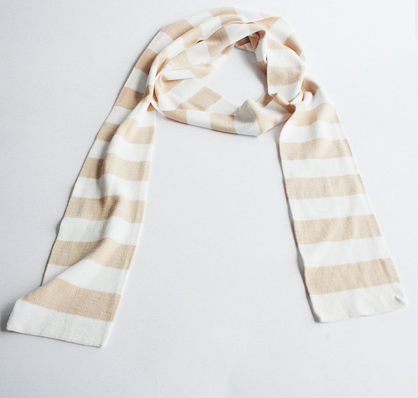 Miękki szalik w paski w kolorze nude. Materiał to prawdopodobnie syntetyk.