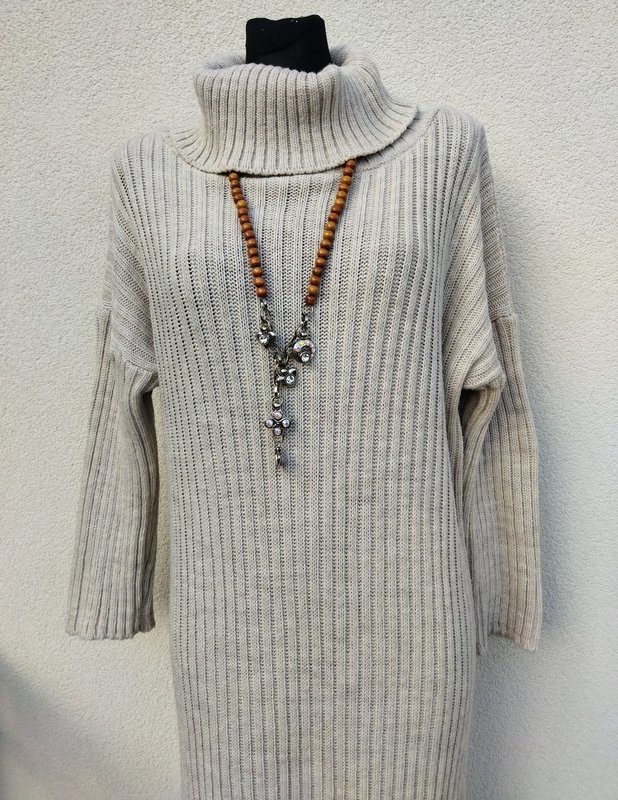 Dobrej jakości dzianinowa sukienka tuba w melanżowej kolorystyce jaśniutkiego chłodnego beżu na pograniczu ze złamana bielą. Z dużym luźnym golfem, z rozcięciami po bokach. podatna , rozciągliwa, bardzo wygodna i uniwersalna.