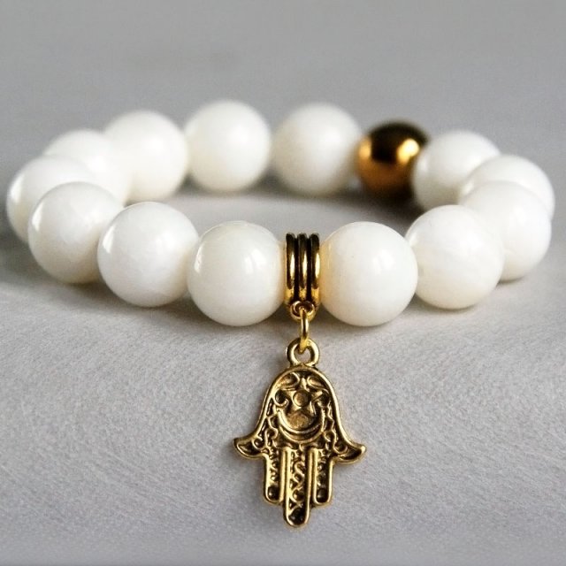 śliczna i niezwykle efektowna bransoletka na solidnej, podwójnej lince elastycznej, wykonana z pięknej muszli w kolorze białym, wpadającym w ecru (BARDZO DUŻE kule 14mm) oraz złotego hematytu i metalowych elementów w kolorze złota... HAMSA (RĘKA FATIMY) -dłoń dobrych, sprawiedliwych uczynków, chroni przed złem i chorobami, niesie szczęście i radość.... ... zobacz też podobne muszLOVE bransoletki ;-) PASUJE NA NADGARSTEK 15-16cm.... BIŻUTERIA ZAWSZE PODRÓŻUJE W OZDOBNYM OPAKOWANIU :-) ... zobacz przykładowe zestawy ...