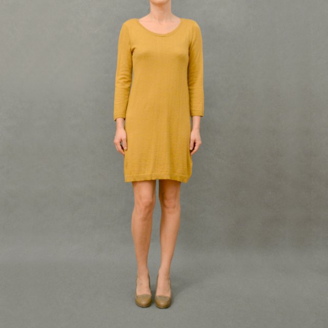 Dzianinowa sukienka w musztardowym kolorze. Z tyłu guziczki. Lekko podgryza wrażliwą skórę.