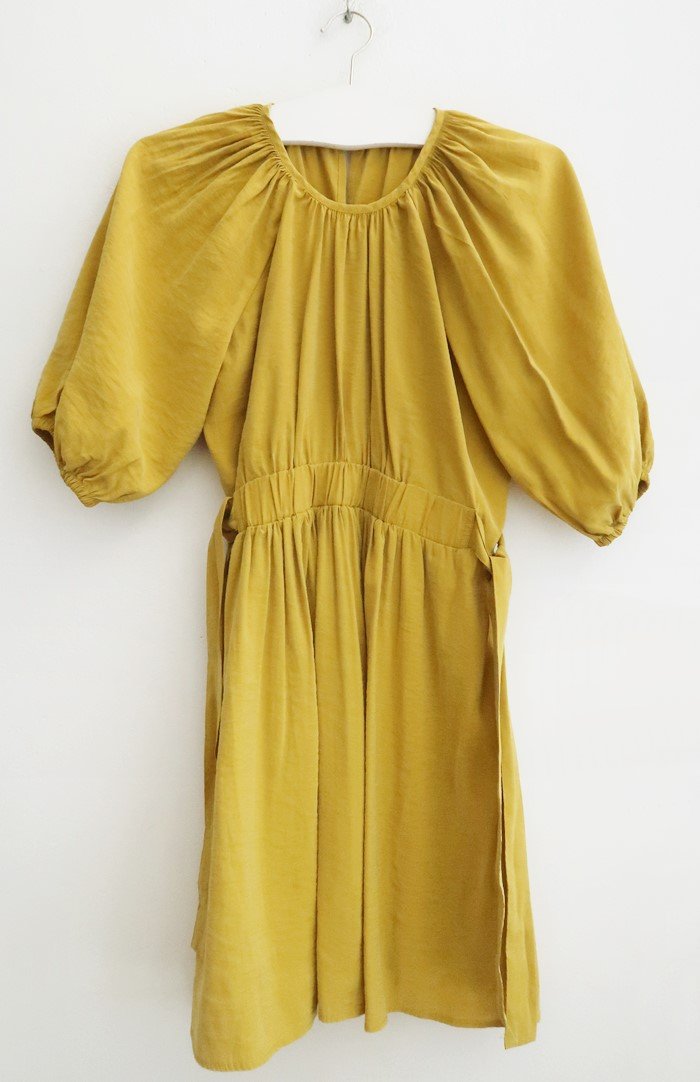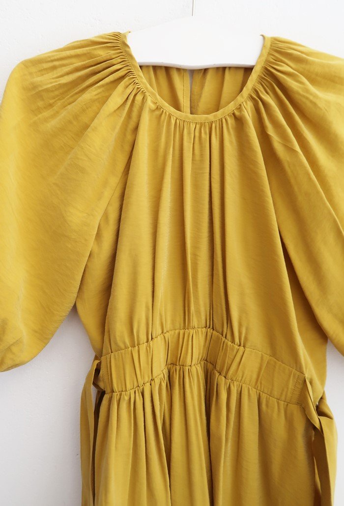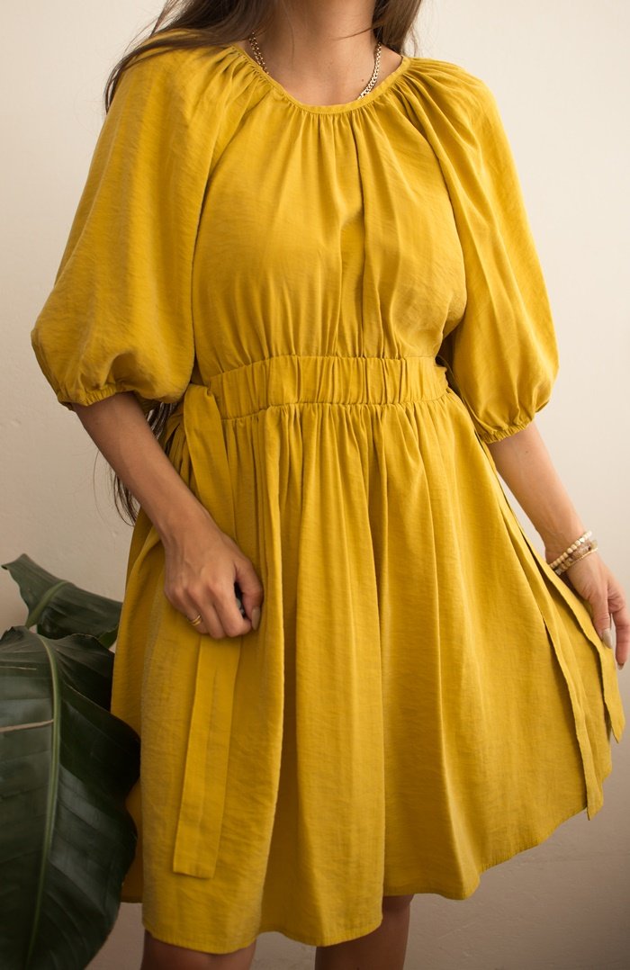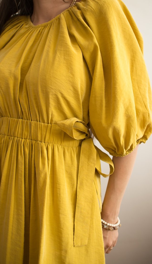Krótka musztardowa sukienka z bufiastymi rękawami.