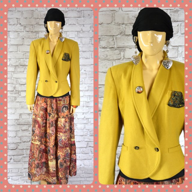 Cudny musztardowy wełniany żakiet z kieszeniami, bardzo ładnie skrojony, delikatnie taliowany, zapinany na logowane guziki, przy mankietach również posiada guziczki, żakiet jako ozdobę posiada po jednej stronie wszytą wzorzystą butonierkę, po drugiej stronie ozdobna broszka z printem drzewa.Posiada podszewkę,a w ramionach poduszki.
