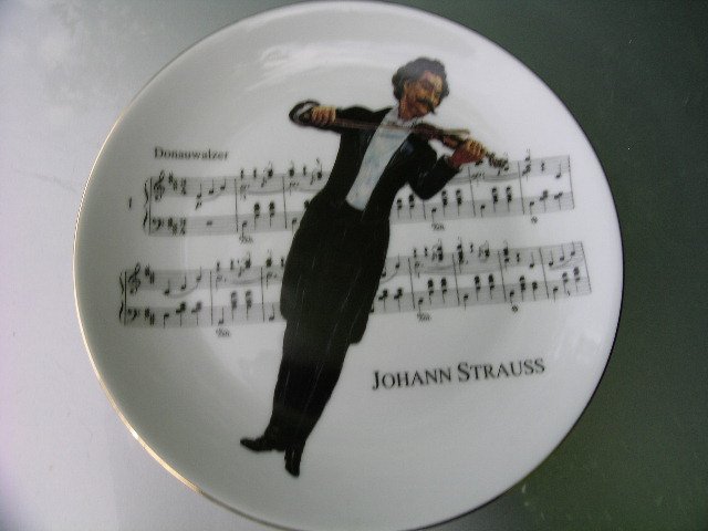 Porcelanowy Talerz,bardzo oryginalnie ozdobiony :) Nuty i sylwetka Jonanna Straussa w pięknie przedstawionej graficznej kompozycji. Czeerń biel w dominancie...Bardzo ciekawy,szczególnie dla miłośnika Muzyki :)