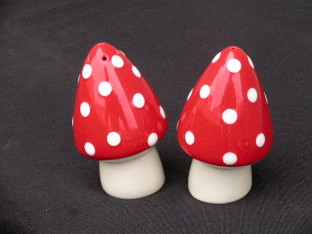 Fantastycznie zabawne i pięknie wykonane porcelanowe przyprawniki sól-pieprz. Ręczne szkliwienie, lekko fakturowe nakrapianie kapeluszy :) Od spodu plastikowe koreczki. Zabawnie przekoszone od pionu :)Szalenie dowcipne :)