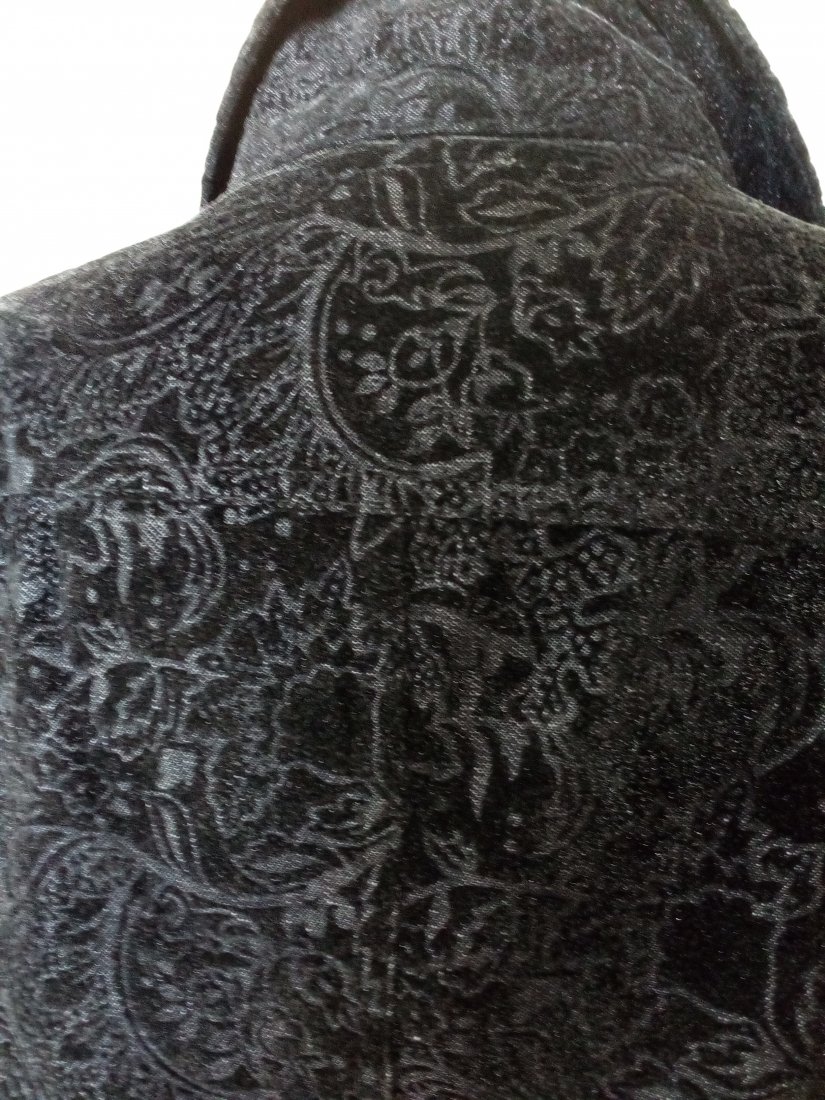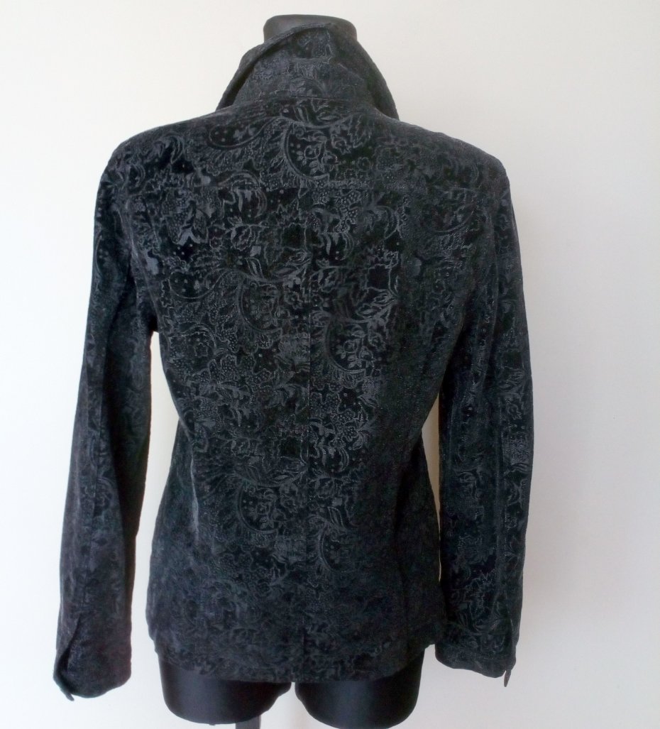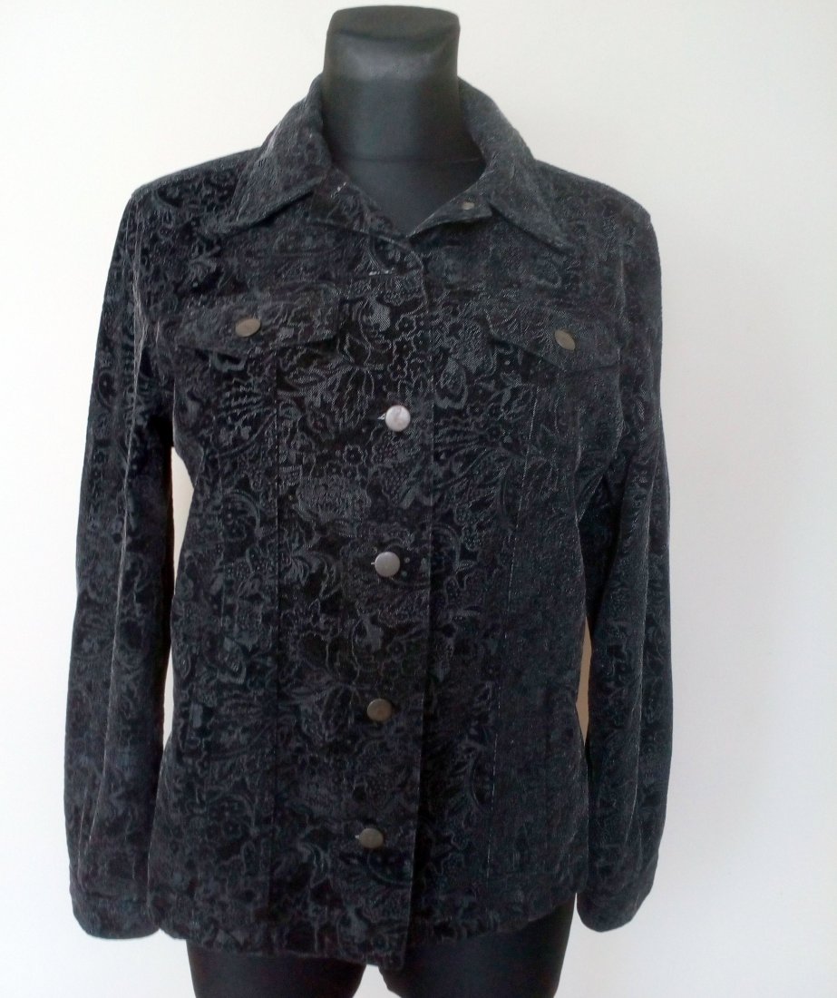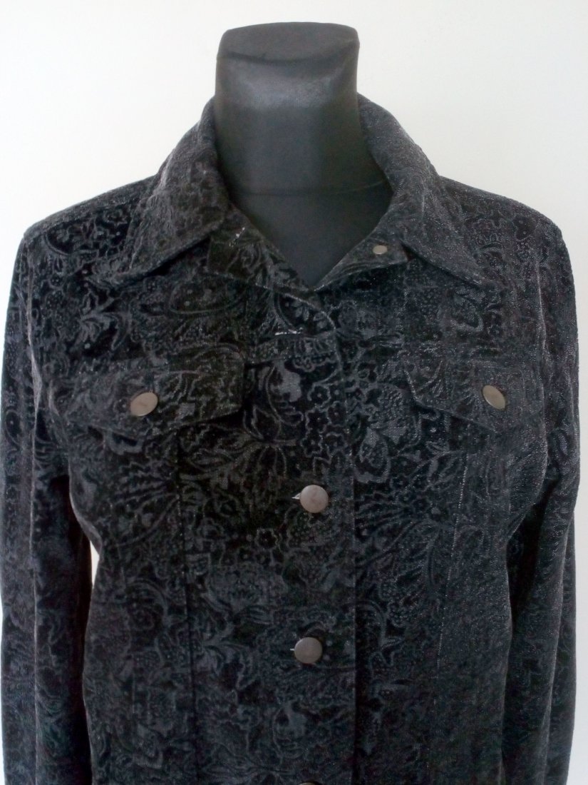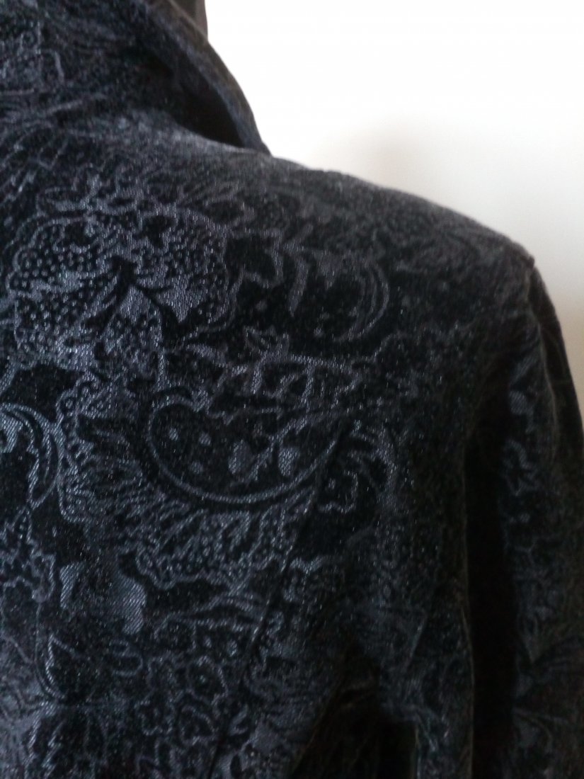 Ładna katana z wytłaczanym wzorem z czarnego aksamitu, tkanina ze srebrzystym nalotem, lekko mieniąca się, katana zapinana na metalowe guziki, na piersiach kieszonki z patkami, u dołu w szach z przodu pionowo wpuszczane kieszenie, na plecach karczek, rękawy z mankietem zapinanym na guzik