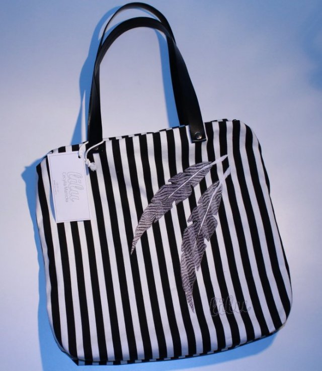 Torebka miejska uszyta z tkaniny w czarno białe paski, ozdobiona pięknymi haftowanymi piórami w odcieniach szarości.
