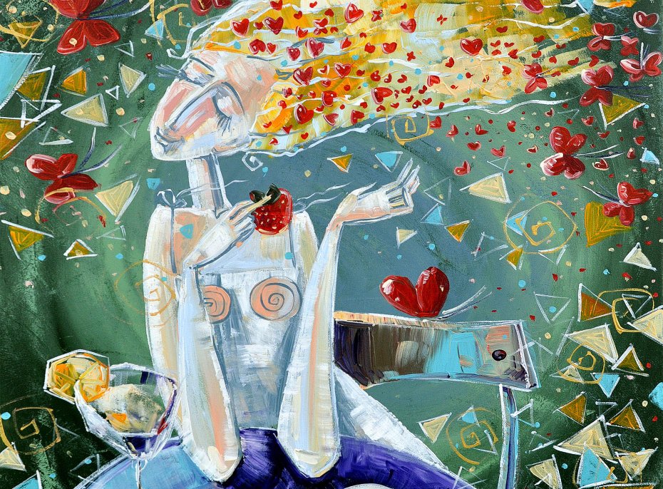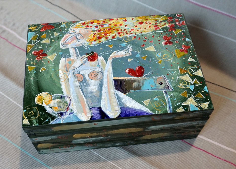 Drewniana szkatułka na różności. Na wierzchniej części szkatułki metodą decoupage umieszczona została reprodukcja obrazu własnego autorstwa, noszącego tytuł "Myśli kobiety". Boki szkatułki są malowane ręcznie, a całość zabezpieczona jest bezbarwnym lakierem.