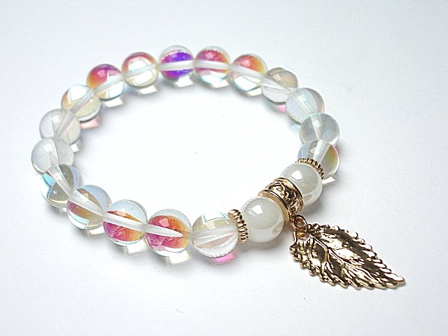 Bransoletka wykonana z naturalnych, minerałów - kwarc mystic [10mm] , szkła opalizującego [10mm] oraz elementów metalowych w kolorze tzw. różowego złota. Bransoletka na gumce silikonowej. Pasuje na nadgarstek 16-17 Biżuteria ozdobnie zapakowana. Możliwość dopasowania do nadgarstka - wcześniej prosimy o kontakt.
