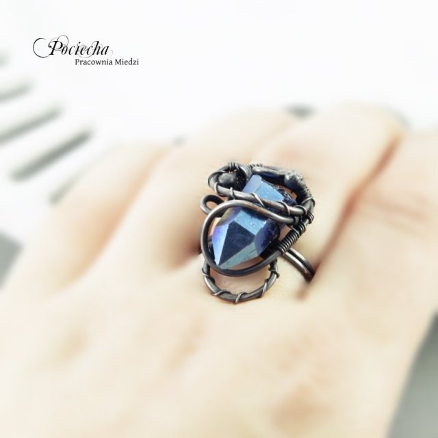 Pierścionek stworzony ręcznie z miedzi, wypleciony i wykuty z miedzi jubilerskiej. Ozdobiony kwarcem tytanowym ( kryształ kwarcu z pasmami tytanu i niobu). Pierścionek ma uniwersalny rozmiar można go dopasować do każdego palca. Korona pierścionka ma wymiary 25 x 19 mm.