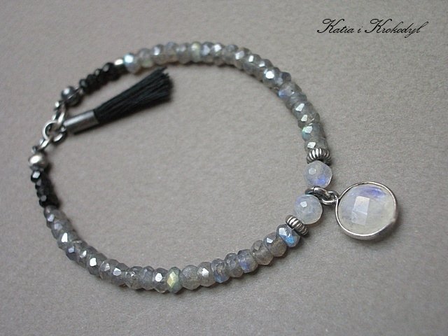 Bransoletka wykonana ze srebra [pr.925] w połączeniu z fasetowanymi oponkami labradorytów mystic [4mm], oponkami szlachetnego spinelu [3mm], kuleczkami kamienia księżycowego [5mm], satynowym chwostem oraz kamieniem księżycowym w okuciu [10mm]. Srebro oksydowane i przetarte. Całkowita długość bransoletki 18,5cm. Biżuteria ozdobnie zapakowana.
