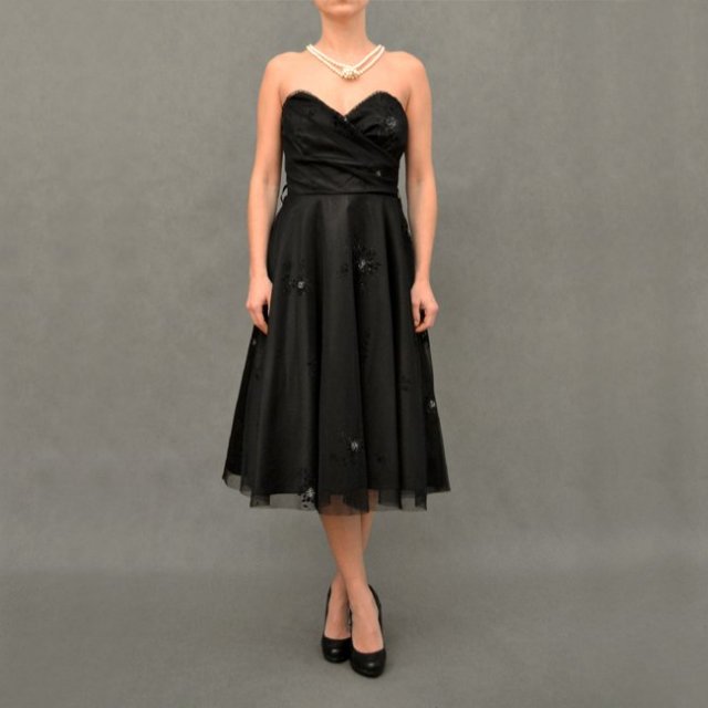 Piękna, czarna sukienka z rozkloszowanym dołem. Na wszelkiego rodzaju bale. Cała pokryta tiulem zdobionym srebrzystymi kwiatuszkami. Od dołu falbana, co by sukienka trzymała formę. W talii ma dwie szlufki np. na wstęgę lub pasek. Polecam.