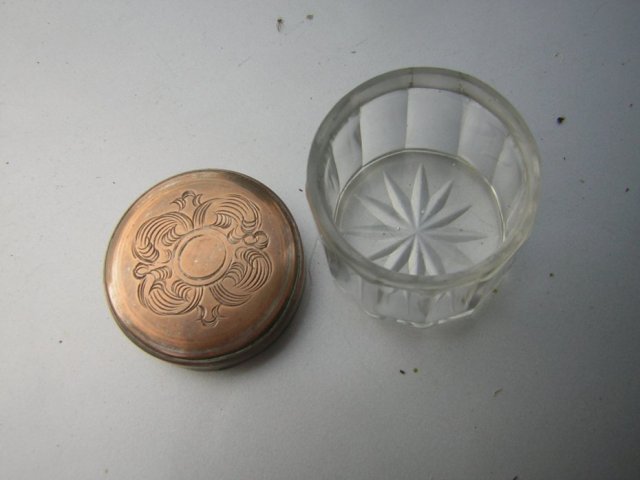 Ciekawe Puzderko na Biżurki inne skarby. Dół szlachetnie szklany, kątny od spodu zdobiny. Przykrywka ze wzorem. Od góry złoto-miedziana, od spodu w kolorze srebrnym. Ciekawa i inna ;)