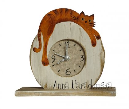 Budzik ręcznie wycięty z drewna, pomalowany farbami akrylowymi, zabezpieczony lakierem półmatowym. Mechanizm na baterię R6 (paluszek). Możliwość zamówienia innego koloru zarówno budzika, jak i Leniuszka.
