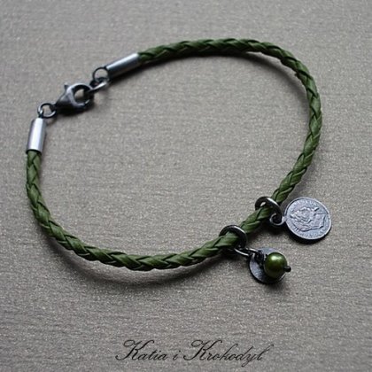 Bransoletka wykonana ze srebra [pr. 925] w połączeniu z plecionym rzemieniem w kolorze seledynowym - zgaszonym [śr. 3mm] oraz luźno zamocowanymi: naturalną, zieloną perełką [5mm] oraz srebrną imitacją monetki. Bransoletkę można nosić jako uzupełnienie do każdej innej bransoletki lub jako samodzielny element. Dobrze komponuje się z bransoletką Byle do wiosny. Całkowita długość bransoletki 19,5cm. Pasuje na nadgarstek 16cm. Biżuteria ozdobnie zapakowana.