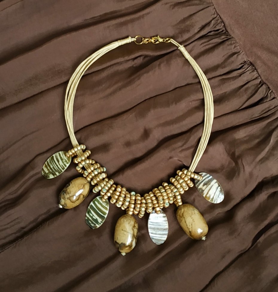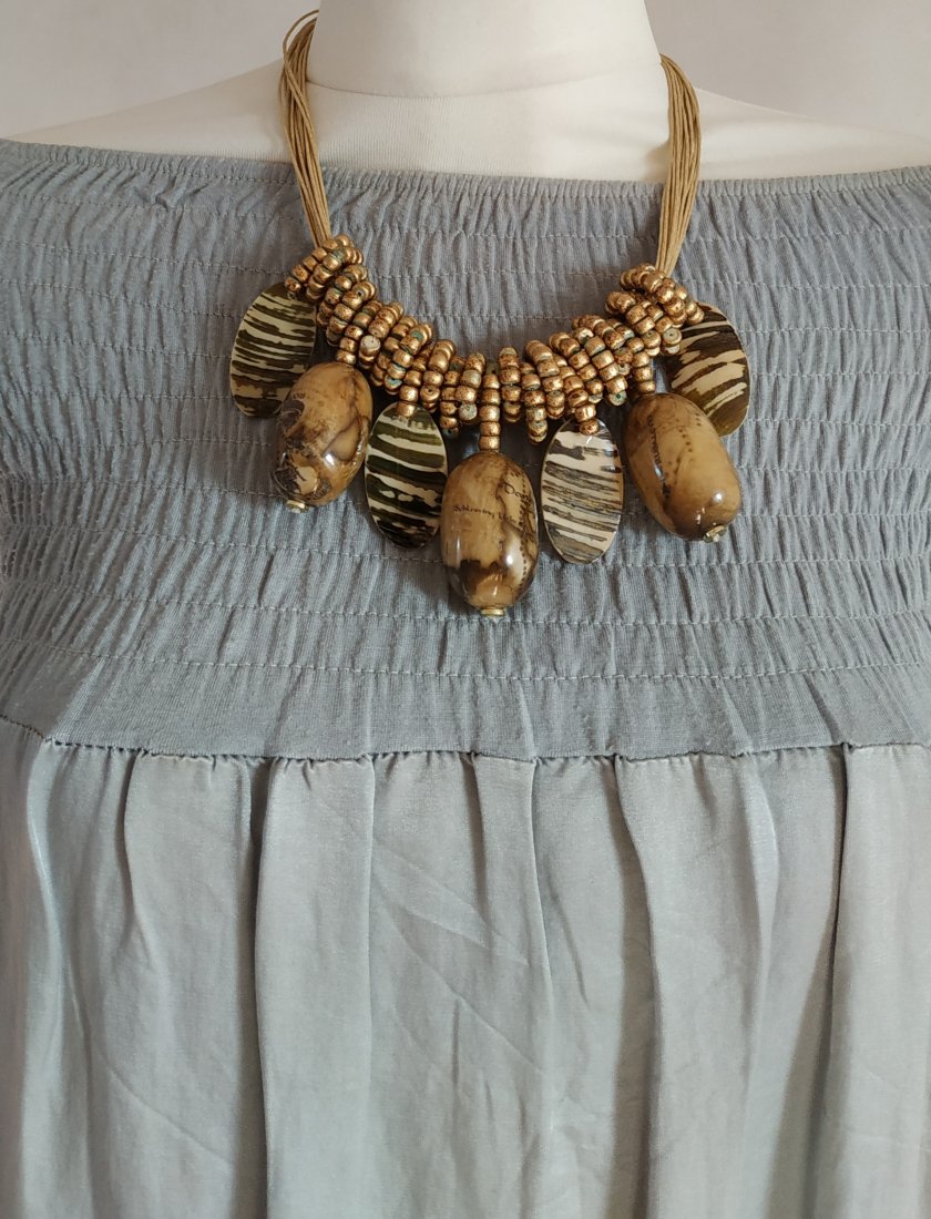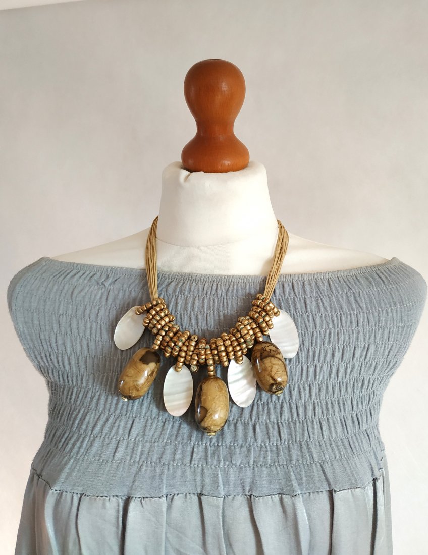 ciekawy, złoto beżowy naszyjnik, dwustronny. Na wiązce ze sznurka cieniowane baryłki na przemian z opalizującymi perłowymi elipsami. Z drugiej strony są one prążkowane.
