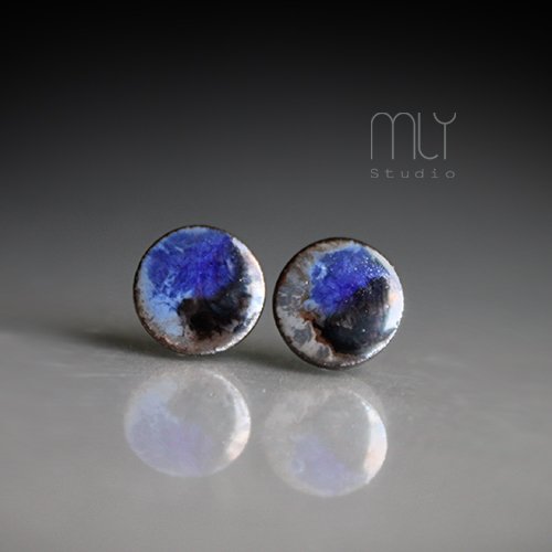 Ceramiczne okrągłe kolczyki w formie sztyftów, ręcznie wykonane z delikatnej czekoladowobrązowej gliny kamionkowej, jednostronnie szkliwione mieszanką szarobłękitnych i brunatnych szkliw z efektem plamek, na sztyftach w kolorze srebrnym. Średnica ok. 11mm. Polecam . Termin realizacji zamówienia to 1-2 dni.