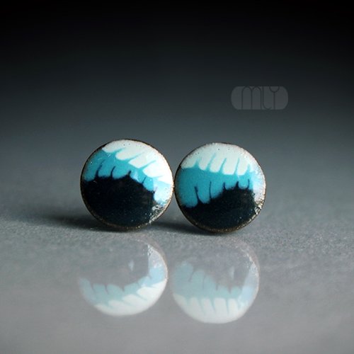 Okrągłe ceramiczne kolczyki w formie sztyftów, ręcznie wykonane z delikatnej gliny kamionkowej, jednostronnie szkliwione granatowo błękitnym szkliwem z efektem plamek, na antyalergicznych sztyftach w kolorze srebrnym. Średnica ok. 11mm.Polecam