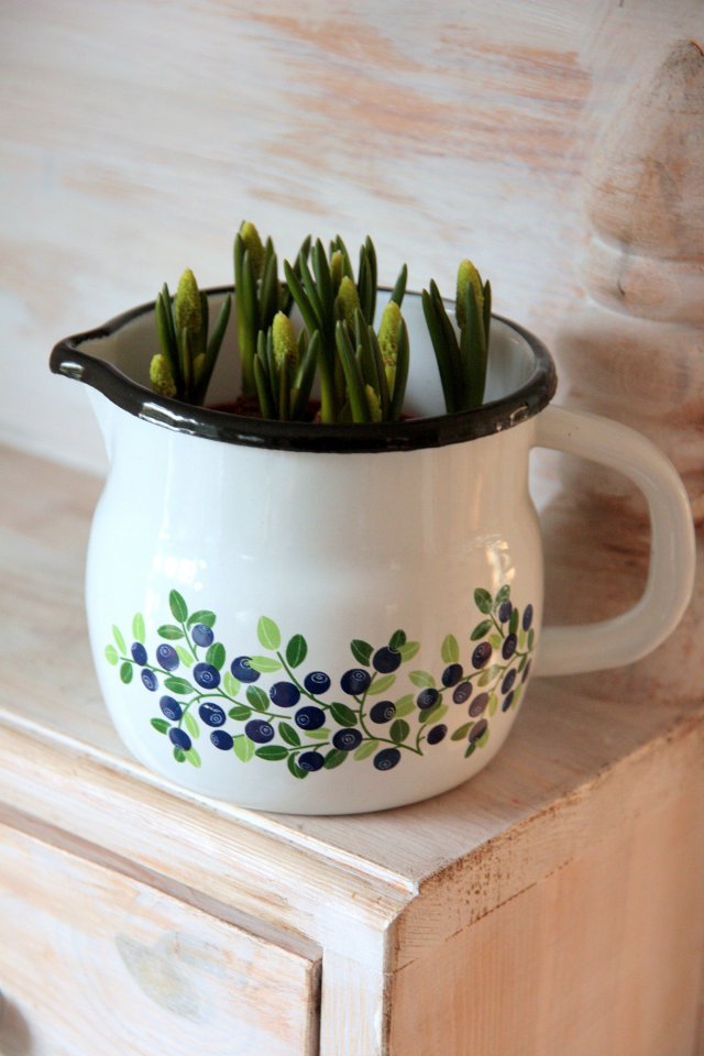 Biały emaliowany dzbanuszek z rączką. W cudne słodkie jagódki:)