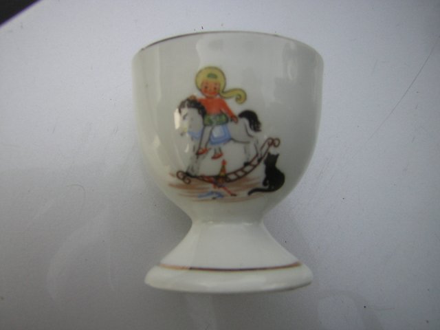Porcelanowy uroczo dziecięco zdobiony kieliszek na jajko. Sygnowany FOREIGN czyli wykonano poza terytorium Wielkiej Brytanii. Mocny, solidny. Nie jest to wyrób pierwszego gatunku, ma podszkliwne pieprze, ale funkcjonalnie bez zarzutu. Biała porcelana na błyszcząco szkliwiona. Wzór z jednej strony, uroczy, dziecięcy, satynowy w żywych kolorach. Złocenie rantów.