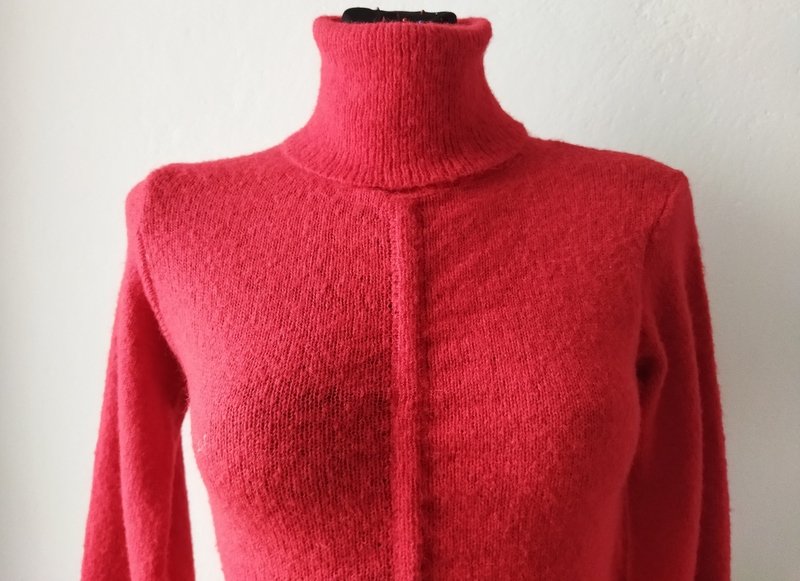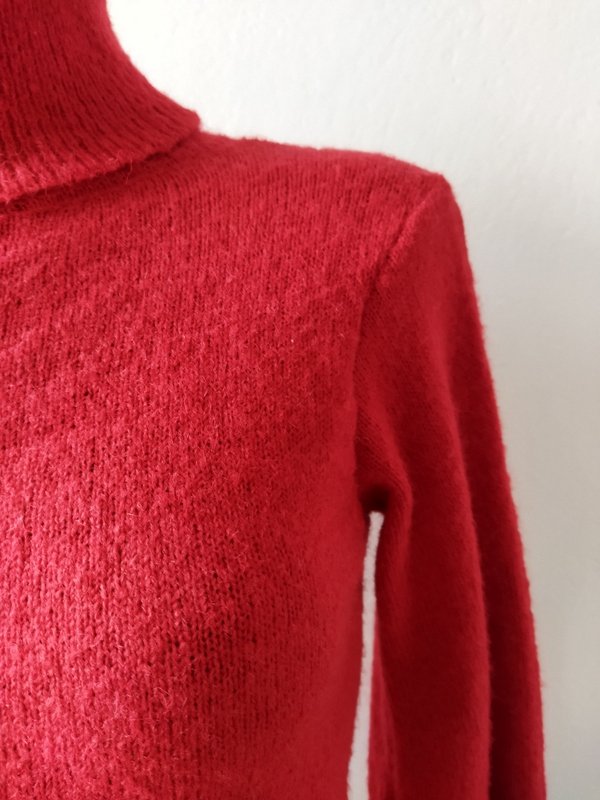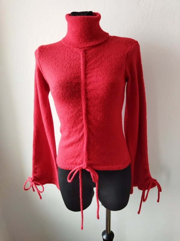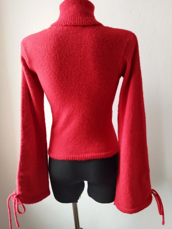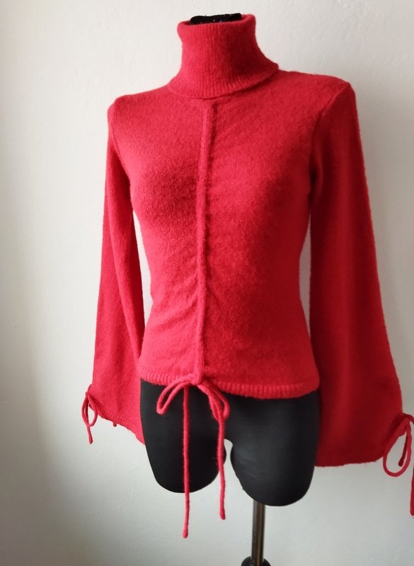 Mocno rozciągliwy, blisko ciała sweterek w czerwonym kolorze z możliwością drapowania troczkami wzdłuż środka przodu i rę Z golfem z poszerzanymi do dołu ręawami.