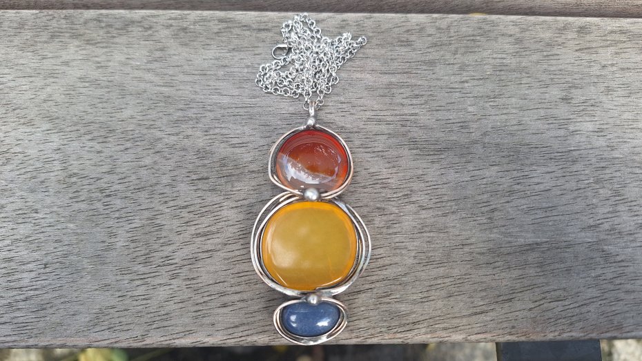 Wisiorek wykonany z miedzi, cyny, jaspisu i agatów. Wymiary ok. 7 na 3 cm. Zawieszony na łańcuszku o długości ok. 50 cm.