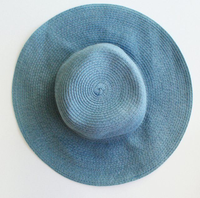 Piękny duży kapelusz w kolorze zgaszonego błękitu z naturalnego tworzywa.