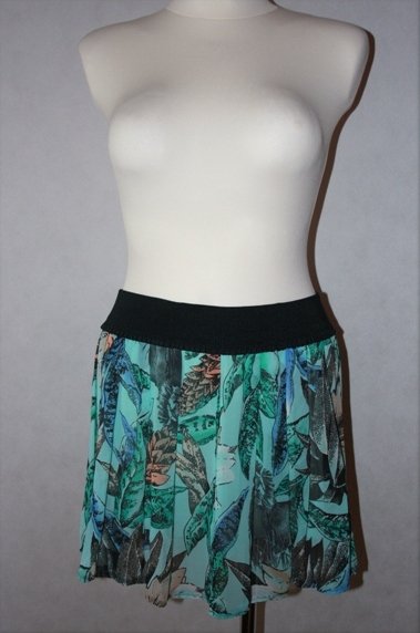 kolorowa spódniczka plażowa mini, na podszewce, w pasie szeroka gumka, delikatnie prześwitująca, lekka i zwiewna, wymiary - pas (bez rozciągania) 37 cm, dł. 41 cm, rozmiar z metki 42 wg mnie uniwersalny z racji gumki w pasie, 100% poliester, stan bdb