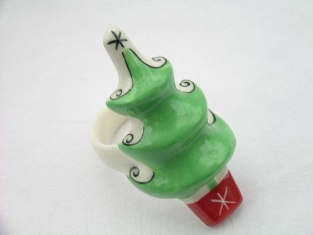 Zabawna porcelanowa obejma serwetkowa w świątecznej odsłonie z uśmiechem. Ręcznie w radosne kolory malowana, na błyszcząco szkliwiona. Porcelana ecru. 4,5 x 6,5 x 7,5 cm. Stan zachowania dobry (delikatny odprysk na ecru początku pierścienia; bez szwanku w używalności :)