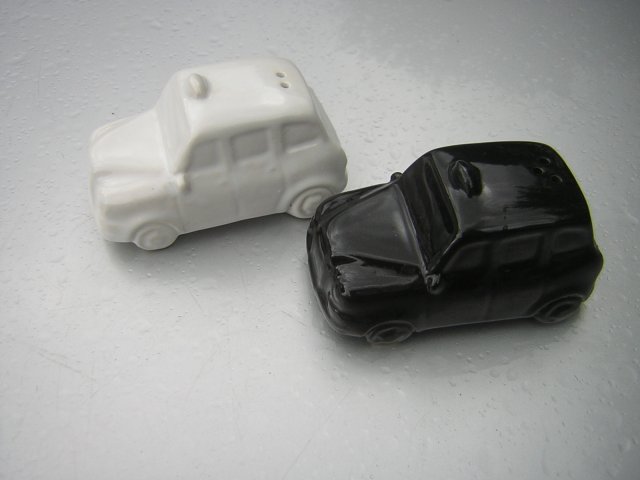 Ciekawy zestaw na sól i pieprz...dla miłośników motoryzacji ;) Czarny i biały samochód, z dziurkami od góry i plasticzanymi zatyczka mi od spodu. Duże, pojemne, dekoracyjne. ..fantazyjne, inne. Ceramika na błyszcząco szkliwiona, nie sygnowana.