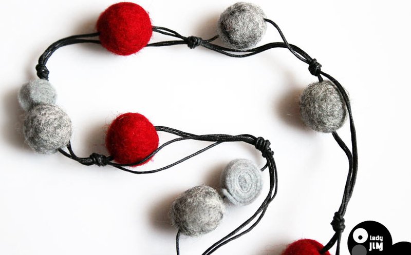 Bardzo lekkie korale z kul z filcu i filcowych elementów. Filcowe kule szare i czerwone. Niepowtarzalne i przyciągające uwagę.