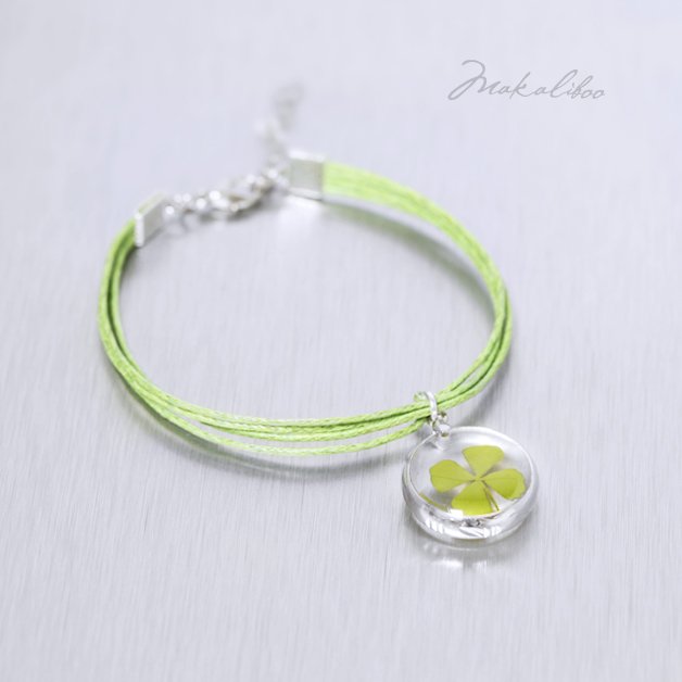 rosta, kobieca bransoletka przyjaźni - Na szczęście. Cherms o średnicy 18 mm, kryje w sobie prawdziwą czterolistną koniczynkę zatopioną w żywicy. Każdy egzemplarz jest niepowtarzalny. Pasuje na nadgarstek 14 - 16cm. Baza w kolorze srebrnym. Sznureczki bawełniane.